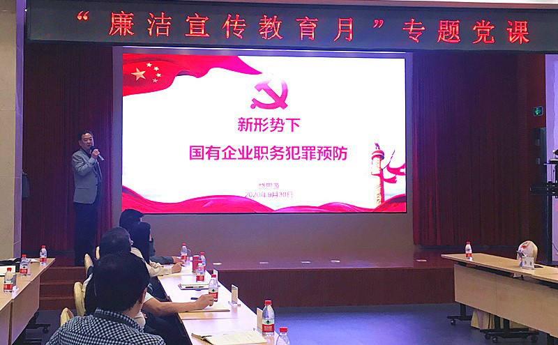 根據公司黨風廉政建設宣傳教育月活動安排,9月30日上午,公司黨委副書記、紀委書記饒思源同志在30樓報告廳為黨員干部講授了題為“新形勢下國有企業職務犯罪預防”的