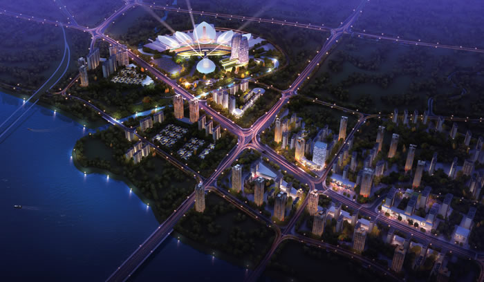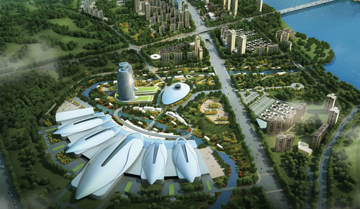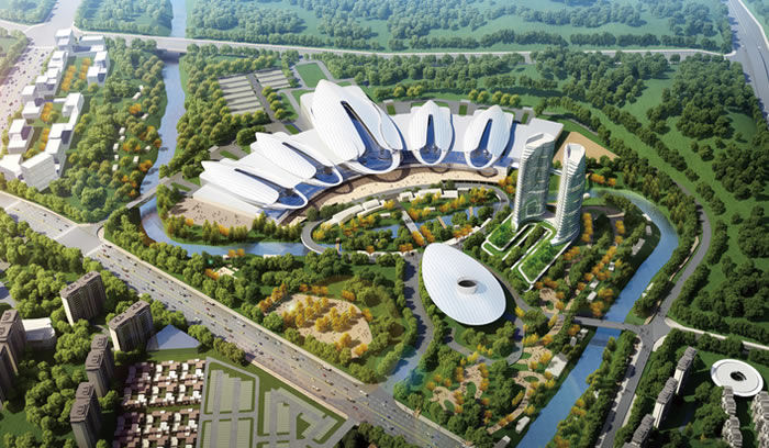 會展核心區分三棟單體建筑組成,分別為會展中心,會議中心,辦公酒店商業綜合體; 其中會展中心分為地面會展層,地下停車層,夾層辦公管理層,以及親水商業區。會展中心主體部分由5個大 型會展中心,一個大型綜合前廳組成,其中最大的展廳為100Mx200M,采用桁架結構體系,最大跨度為50M,建 筑高度為35M,可根據各種需求靈活布展;其他展廳為60Mx120M,最大跨度為30M,建筑高度為25M。會展中心 屋面為銀白色金屬屋面,前廳玻璃幕墻為桁架體系玻璃幕墻系統,玻璃分塊尺寸接近4Mx2M。 會議中由公共大廳,一個2000M²左右的大型報告廳,一個700M²左右的重型會議廳及若干中小型會議室組 成;會議中心采用鋼結構桁架體系,底層架空,建筑高度為25M;由金屬板及玻璃幕墻包覆。