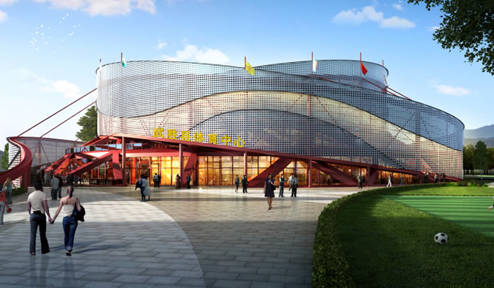 本項(xiàng)目是由武勝縣人民政府整體開發(fā)的武勝體育中心項(xiàng)目,該項(xiàng)目位于武勝縣迎賓大道與創(chuàng)新路交叉口東南側(cè),地塊呈長(zhǎng)方型,地塊內(nèi)地勢(shì)高差較大。本項(xiàng)目用地面積27591.47㎡,總建筑面積27390.07㎡,其中計(jì)容建筑面積13058.13㎡,容積率0.47。主要建筑性質(zhì)為體育中心、配套商業(yè)建筑及地下車庫(kù)。體育館建筑形態(tài)以雨中旋轉(zhuǎn)的球?yàn)樵汀Mㄟ^(guò)對(duì)在雨中旋轉(zhuǎn)的球體的動(dòng)作軌跡的重新詮釋,形成與之流暢的有韻味的建筑造型。圓形的建筑形態(tài)符合體育館本身的功能需求。整體風(fēng)貌運(yùn)動(dòng)、大方、典雅。